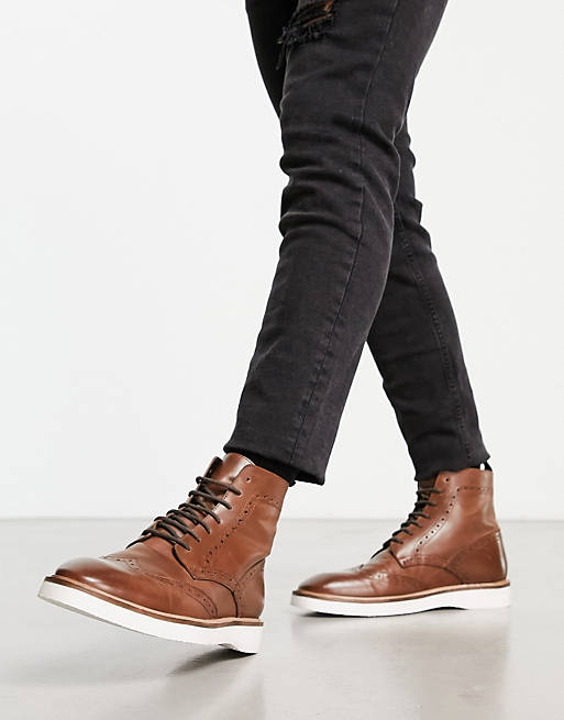 Lace Up Brogue Boot In Tan Leather With Contrast White Sole